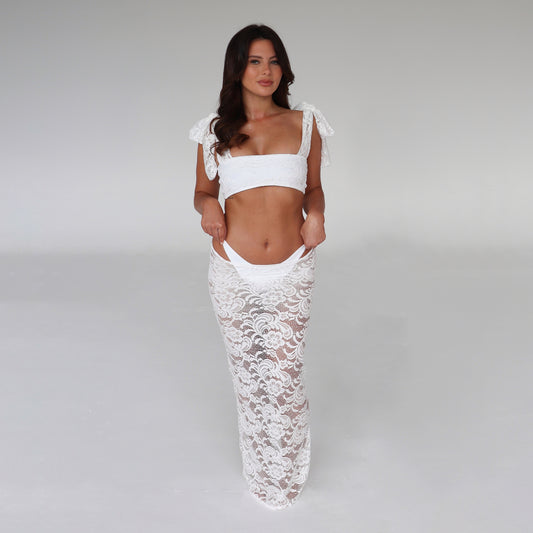 White Lace Extra Thick Tie & Maxi Skirt Three Piece Set