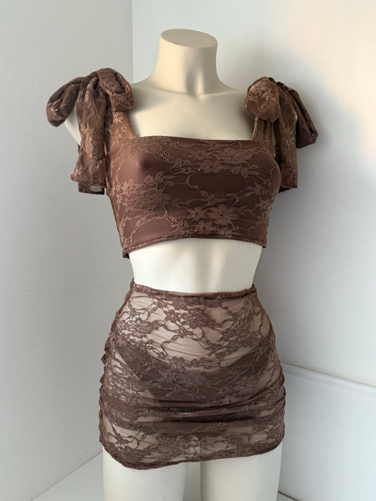 Chocolate Lace Extra Thick Tie & Mini Skirt Three Piece Set